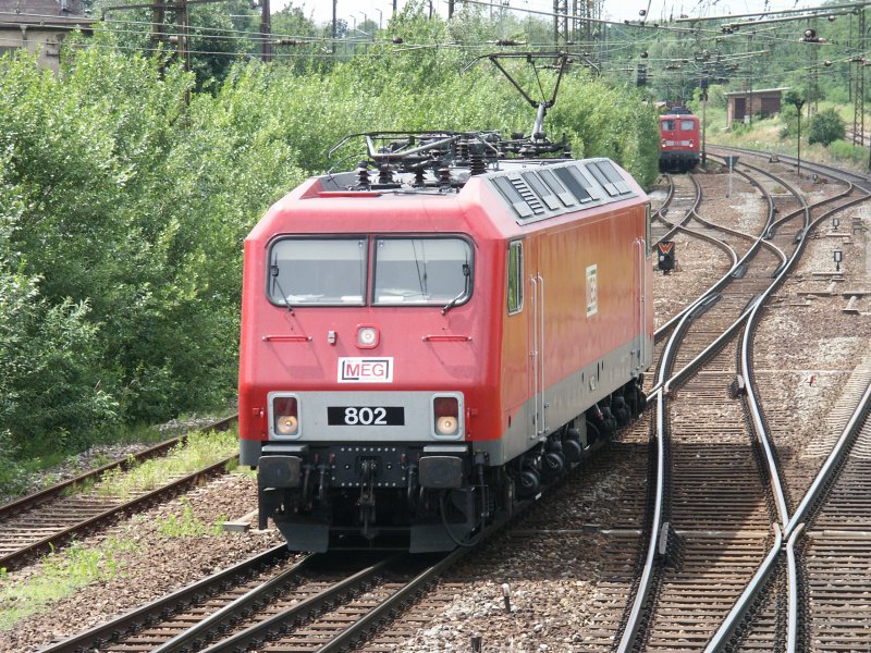 MEG 802 diemal schon mit weißem Balken am 27.06.07 bei der Fahrt durch Riesa. Hinten wartet eine 140 mit Zug auf Weiterfahrt