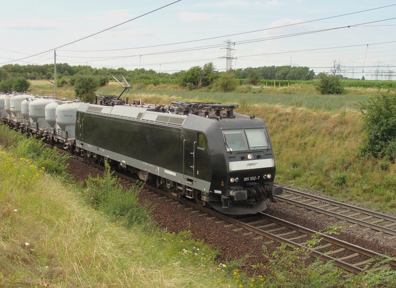 MRCE 185 552-7 mit einem Ganzzug Silowagen. Der Zug kam aus Richtung Braunschweig. Fotografiert am Stadtrand von Magdeburg (Diesdorf) am 30.07.2009.