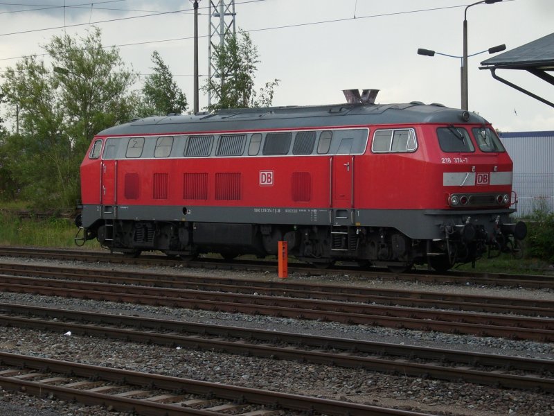 218 104-8 mit einem RE nach Bad Kleinen am 26.07.2009 bei der Einfahrt in den Bahnhof von Plön. Der z.Z nicht mehr in Benutzung befindliche Mittelbahnsteig wird im Zuge des Ausbaus der Strecke Kiel-Lübeck durch einen neuen, 140 Meter langen Mittelbahnsteig ersetzt. Erste Arbeiten beginnen Ende August 2009.