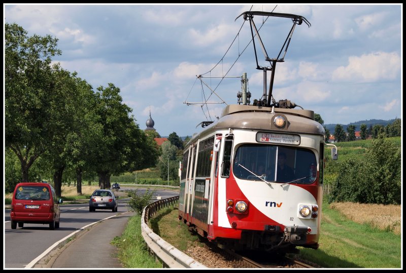 OEG 82 fährt am 20.07.2009 mittags auf der OEG Linie 5R von Weinheim Richtung Heidelberg. Die Aufnahme entstand bei Leutershausen.
