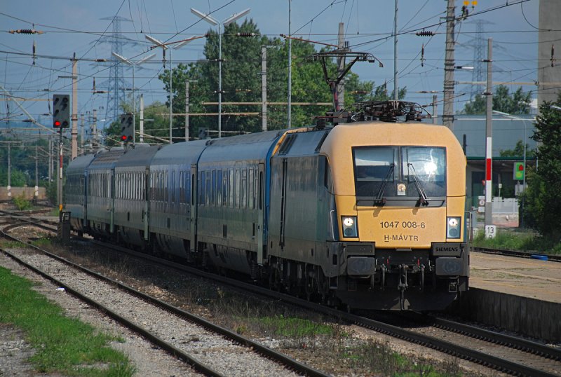 1047 008 am 04.07.2009 vor Eurocity 943 "Bartok Bela" (Wien - Budapest), braust durch den Bahnhof in Himberg.