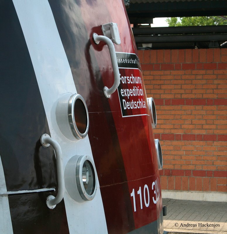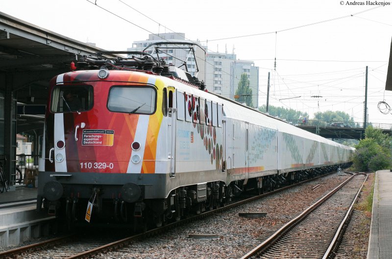 110 329-0 mit dem Science Express auf Gleis 9 in Karlsruhe Durlach 2.7.09