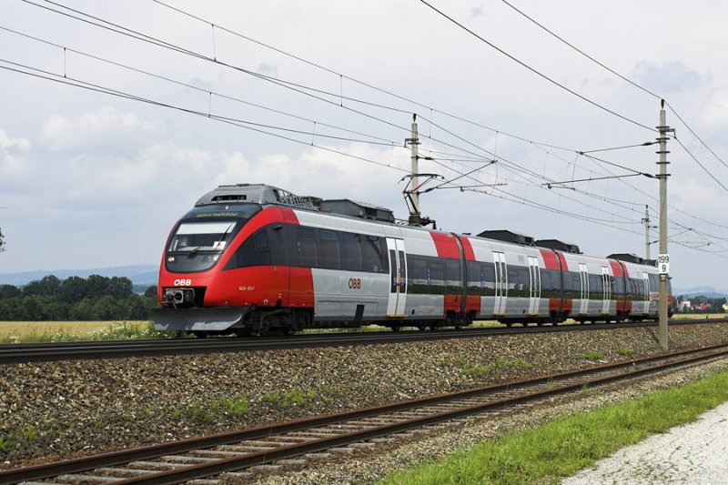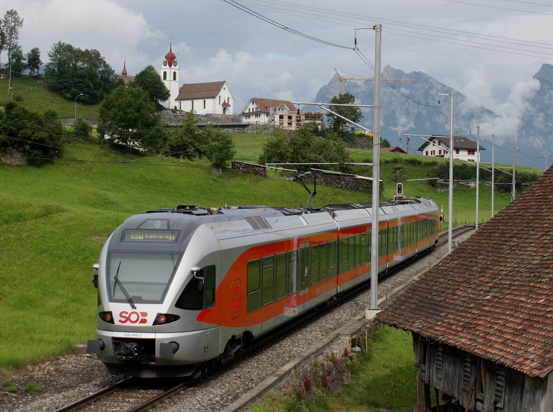 Der SOB Flirt RABe 526 049 am 27.06.2009 unterwegs bei Steinerberg.
