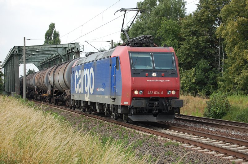 482 034-6 SBB Cargo mit Kesselwagen Ganzzug am 04.07.2009 kurz nah Überquerung des Mittellandkanals bei Peine