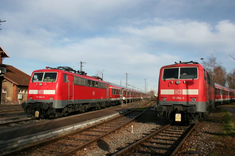 DB 111 062-6 und 111 054-3 warten mit ihren Regionalbahnwagen auf neue Arbeit. Offenburg 30.11.2008 von einem öffentlichen Parkplatz, wie dies auch bei der Geoposition zu sehen ist.