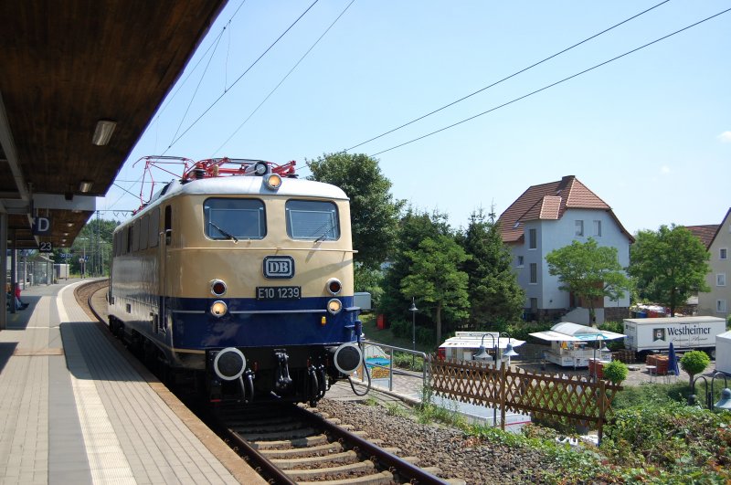 E 10 1239 konnte man schon ab dem 3.07.09 beim Viaduktfest bestaunen. Hier verweilt sie auf Gl. 23 im Altenbekener Bahnhof.