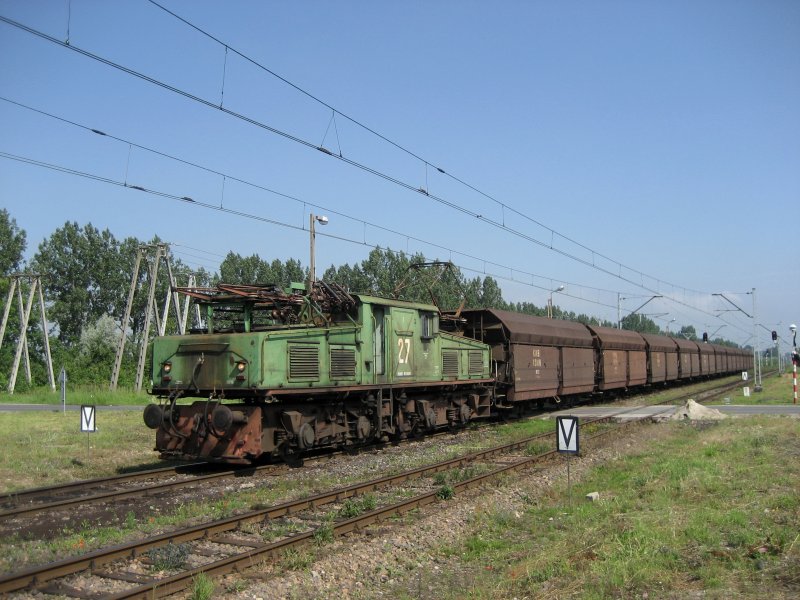 EL2-27 fährt mit Selbstentladewagen am 03.07.2009 in Kleczew. Jede Lok fährt immer mit 10 Wagen.