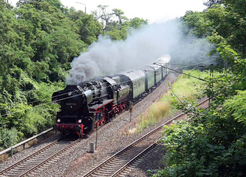 Für 03 1010 durch den Salzlandkreis     Mit 52 8177-9 der Dampflokfreunde Berlin und der Donnerbüchsengarnitur des Vereins Traditionszug Berlin ging es am 04.und 05.07.2009 auf Rundfahrt durch Sachsen-Anhalt. Beide Vereine stellten ihre Fahrzeuge kostenlos zur Verfügung um einen Beitrag zur Erhaltung der Dampflok 03 1010 zu erbringen.
