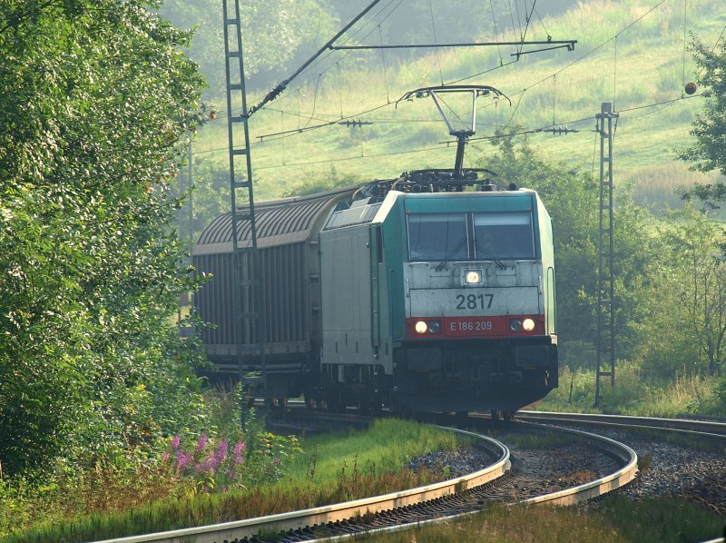 Hier schleppt E 186 209 einen schweren gemischten Güterzug von Aachen West die Rampe zum Gemmenicher Tunnel höhe Reinartzkehl richtung Montzen rauf.