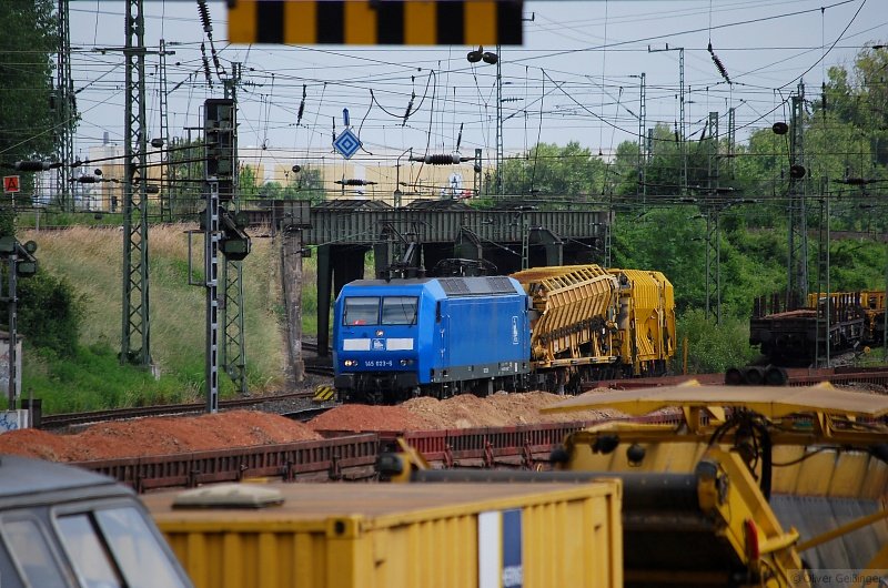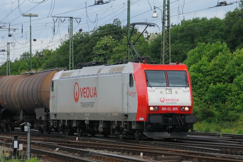 185-CL 005 der Veolia schleppt einen Kesselwagenzug quer über die Nordeinfahrt-Gruppe von Gremberg Gbf Richting Güterumfahrung und weiter Richtung Troisdorf. (19.05.2009).