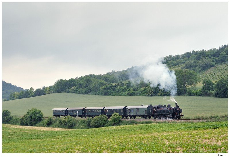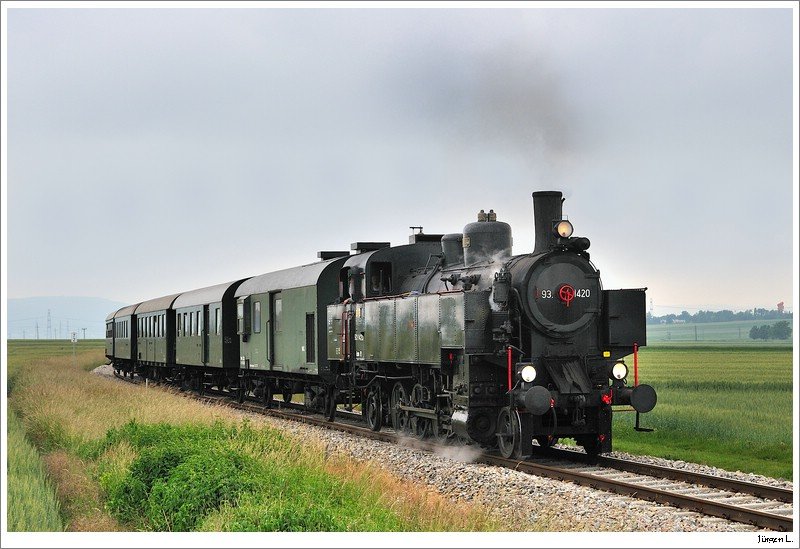 93.1420 brachte am 06.06.2009 den Nostalgiesonderzug von Ernstbrunn nach Korneuburg. Die Aufnahme entstand kurz vor Stetten, Sekunden danach begann es zu schütten.
