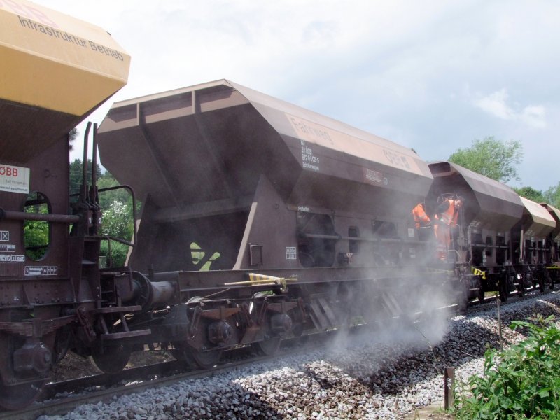 Schotterwagen(80819720608-5) beim einschottern des Gleisbettes auf der Innkreisbahn bei Mehrnbach; 090611