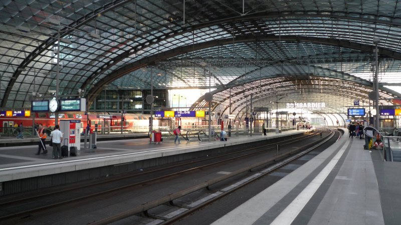 Hauptbahnhof Berlin - wirklich imposantes Bauwerk. OK, vielen mag es nicht gefallen, ich stehe ja auf moderne Architektur. Was ich total verblüffend finde: Oben gibt es neben den zwei S-Bahn Gleisen nur in jede Richtung zwei Gleise für die Regional- und Fernzüge. Die Weichenanlage ist sehr übersichtlich: Je eine Weiche vorne und hinten, das war's.