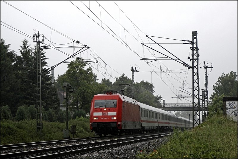 Durch den vielen Regen ist die 101 012 (9180 6101 012-3 D-DB) sicher nicht so sauber geworden. Dank Untersuchung in Dessau ist sie wieder im sauberen Verkehrsrot unterwegs und ist am 11.06.2009 bei Nordbögge mit einem InterCity unterwegs.