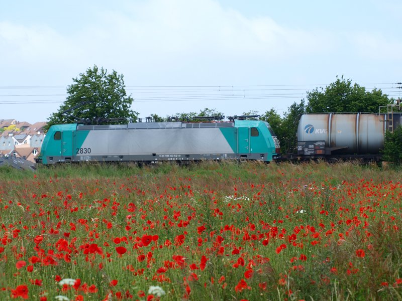 Am blühenden Mohn vorbei auf dem Weg nach Montzen ist diese belgische 186er mit einem Kesselzug in der Steigung zum Gemmenicher Tunnel unterwegs.