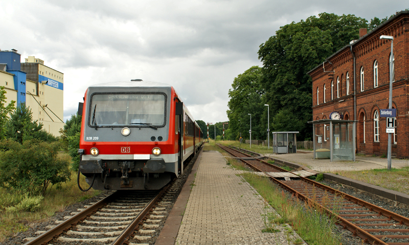 628 218 und 628 209 am 21.06.2009 als RB nach Lüneburg im Bahnhof Dannenberg Ost.Die Wendlandbahn wird sonntags im 4 Stunden-Takt bedient.