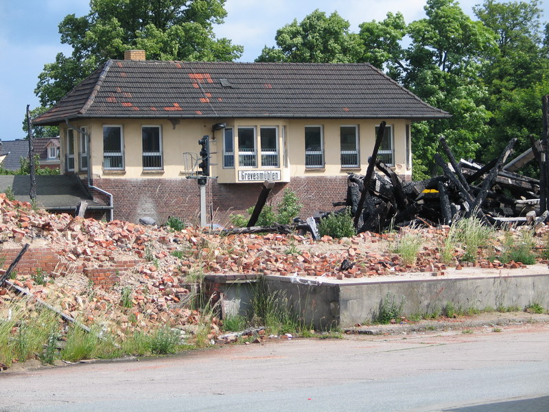 Das Stellwer von Grevesmühlen steht nun hinter dem abgebrannten Speicher. 10.06.2009