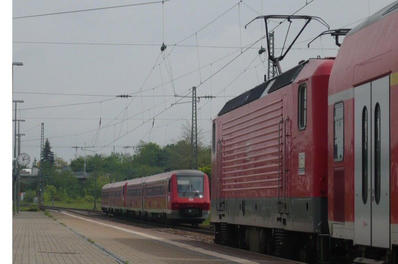Diese, mit Glück entstandene, Aufnahme entstand Ende Mai 09 in Reutlingen. Während der ausfahrende IRE in einer guten 1/2 Stunde voraussichtlich Stuttgart erreichen wird, wartet auf Gleis 2 die Neckar Alb Bahn auf die Freigabe zur Abfahrt in Richtung Universitätsstadt Tübingen.
