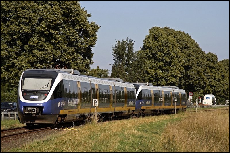 VT703 und VT709 sind als NWB81556 (RB67 "DER WARENDORFER"), Münster(Westf)Hbf - Bielfeld Hbf - Altenbeken, unterwges. Hier wird gerade das Stadtgebiet von Warendorf erreicht. (24.06.2009)