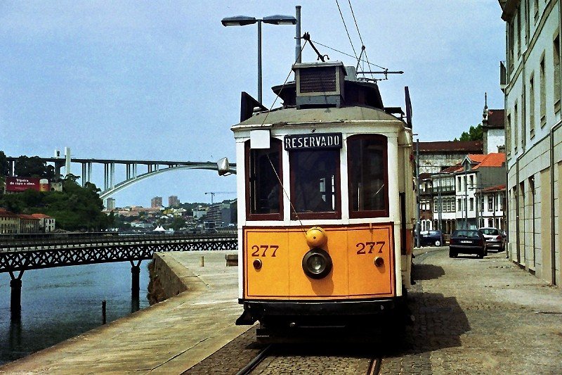 Tw 277 und 275 am Douro-Ufer mit der Arrábida-Brücke und der Douro-Mündung im Hintergrund (10. Mai 2009)