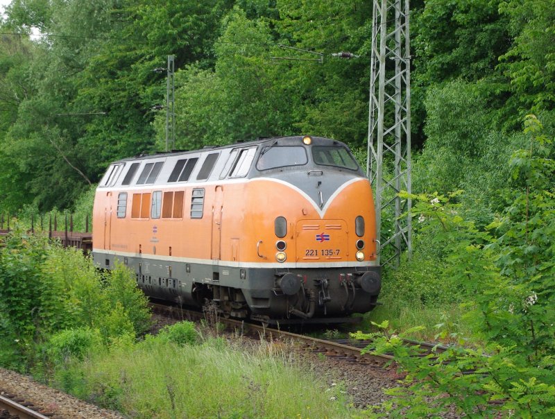 Die 221 135-7 der Bocholter Eisenbahngesellschaft mit leerem Kupferzug in Fahrtrichtung Kassel am 05.06.2009 durch Eichenberg.