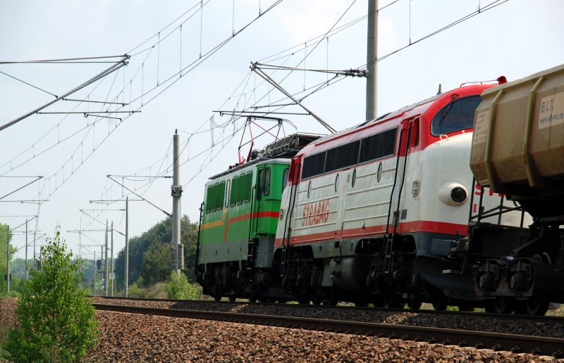 WAB-60 und eine Nohab-Diesellok von Eichholz Rail ziehen am 03.05.09 zusammen einen Güterzug durch Muldenstein Richtung Berlin.