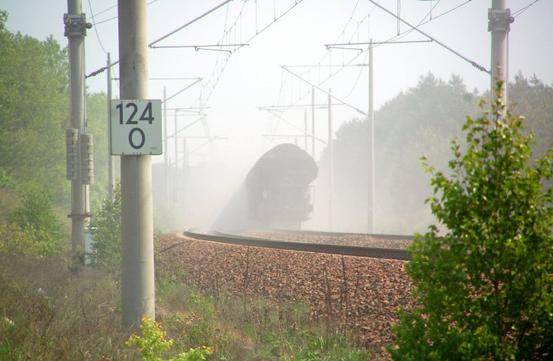Nachschuss auf den Güterzug, welcher eine starke Staubwolke mit sich zog. Fotografiert am 03.05.09 in Muldenstein.