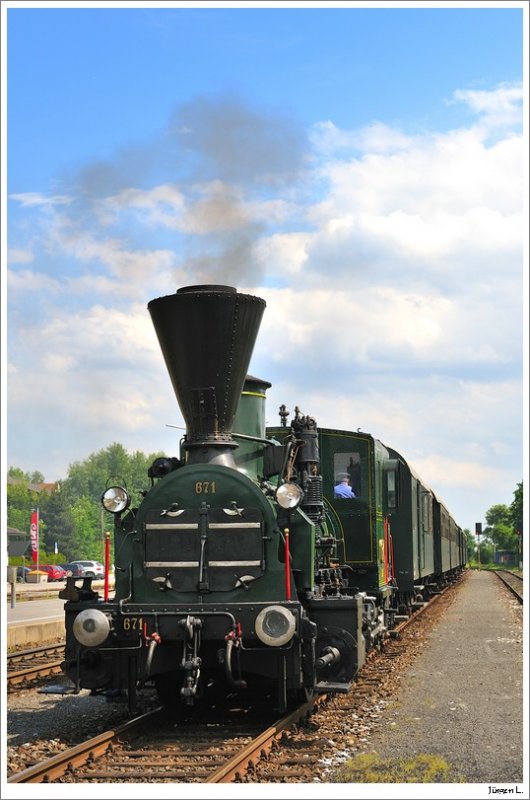 Am 6.6.2009 fand eine Sonderfahrt der Steirischen Eisenbahnfreunde von Graz nach Groß St.Florian zum steirischen Feuerwehrmuseum statt. Das Bild zeigt den Zug beim Einschnitt im Kaiserwald zwischen Premstätten-Tobelbad und Lieboch. Der Höhepunkt dieser mit der GKB 671 bespannten Sonderfahrt fand später in Preding in Form einer Doppelausfahrt mit dem Stainzer Flascherlzug statt. Besonderen Dank an HP für seinen Guide :-)