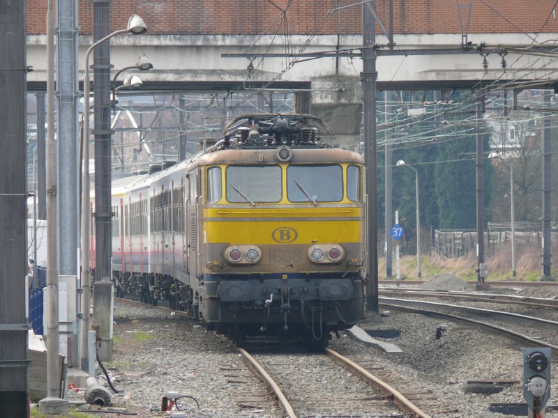 Wieder einmal Gast in Welkenraedt. SNCB-Lok 1608 in den bekannten Märklin-Farben wartet auf einem Abstellgleis. Aufgenommen am 01/03/2009.