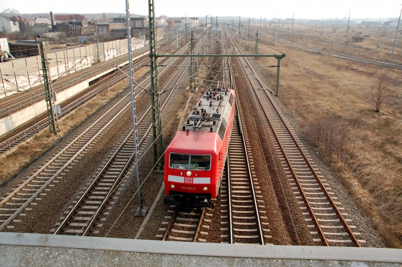 Ein IC-Sandwich mit ziehender 120 135 durchfährt am 04.03.09 Gräfenhainichen Richtung Leipzig.