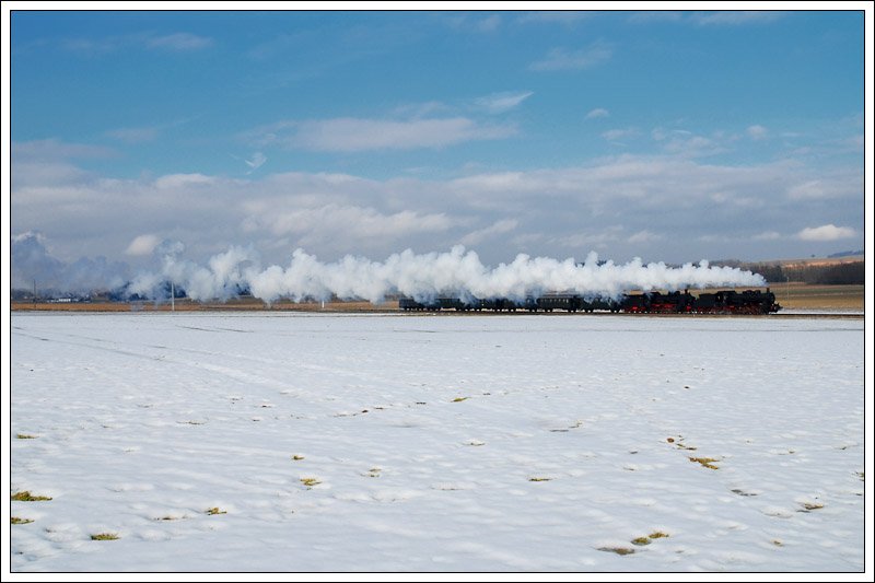 Die in 01 1533 umbezeichnete ÖGEG Lok 01 533 mit dem IGE Sonderzug E 16188 aus Hersbruck über Simbach, Ried und Attnang-Puchheim nach Freilassing am 28.2.2009 kurz vor der Durchfahrt in Geinberg.