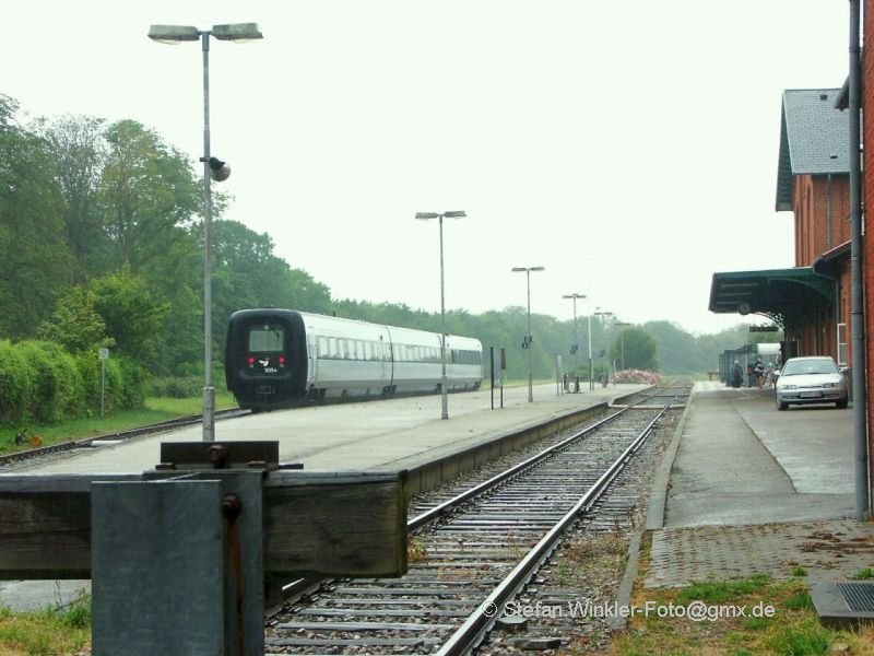 Auch das ist Dänemark: Bf. Thisted im strömendem Regen, Juli 2008. Eine Diesel-Gumminase wartet auf die Rückfahrt ins Landesinnere. Links hinten ausserhalb des Bildes existiert der alte 2 ständige Lokschuppen, er dient jetzt als Fitness-center/Bowlinghalle....