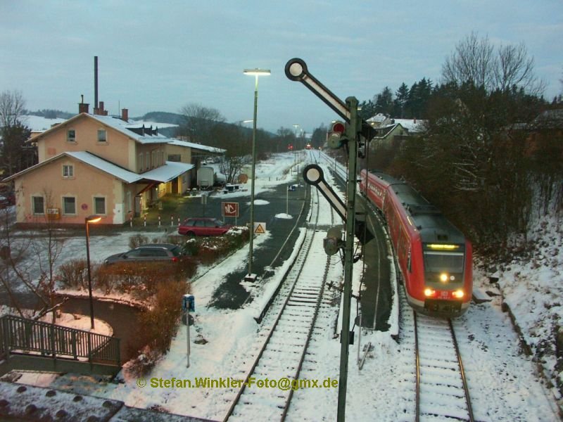 Eines meiner Lieblingsbilder aus neuerer Zeit, und dennoch schon historisch. Ein 612 erhält Ausfahrt auf der Nebenbahn in Selbitz nach Hof. Dezember 2008 früh um kurz nach 7 Uhr. Hier hat er mit einem 628 nach Bad Steben gekreuzt. Unser 612 wird dann via Hof nach Saalfeld weiterfahren. Heutzutage gibt es den Plantag mit der Nebenbahnleistung immer noch. Nur die Signalflügel sind demontiert und der Zur Ri. Hof fährt nun auf dem linken Gleis ab.... Mir gefällt es aber genau so. Schade dass ich den im Jahre 2006 diese Leistung fahrenden 610 nur ein einziges Mal, bei seinem letzten Einsatz hier, erwischt habe...