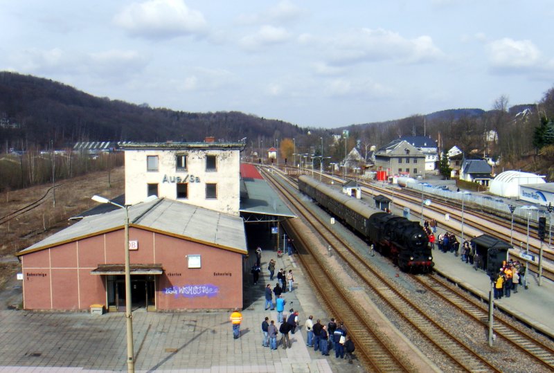 Der Sonderzug des SEM Chemnitz mit Zuglok 58 311 am 14.03.2009 im Bahnhof Aue. Hier war die Lok mehrere Jahre beheimatet. Das Empfangsgebäude ist mittlerweile auch dem Abrisswahn zum Opfer gefallen.