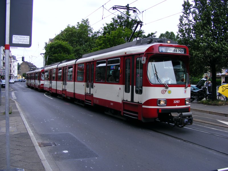 Eine Doppeltraktion aus DUEWAG-Stadtbahnwagen GT8SU in Düsseldorf-Lierenfeld als Zug der Linie U75 nach Neuss Hbf am 20. Juni 2008.