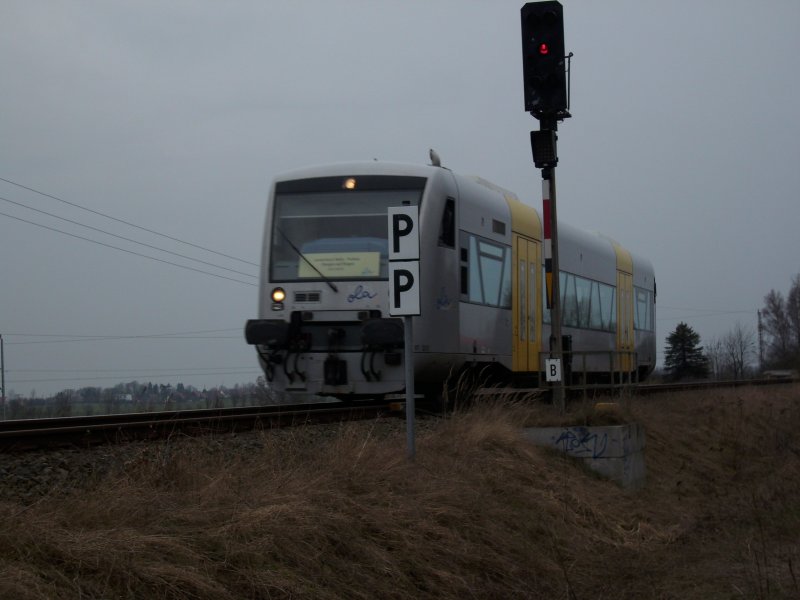 OLA-Triebwagen VT010 verläßt am 12.März 2009 Bergen/Rügen in Richtung Lauterbach Mole.