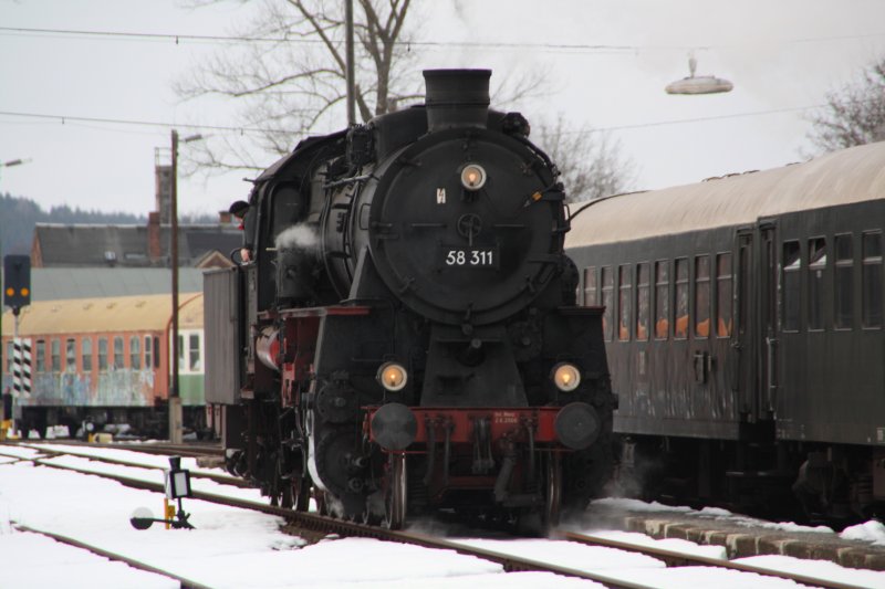 58 311 dampft im Bahnhof Schlettau vor sich hin. (14.03.09)