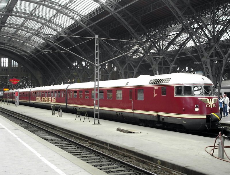 Auf seiner Rundreise durch Deutschland, kam der Weltmeisterzug 2006 anläßlich des WM-Bahntages auch nach Leipzig. Von hier aus pendelte er mehrmals zwischen Halle und Leipzig. Aufgenommen am 14.05.2006 im Leipziger Hauptbahnhof.
