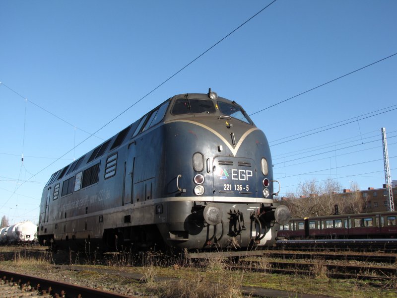 Die Potsdamer Eisenbahngesellschaft hat auch E-Loks im Bestand .aufgenommen am 18.03.2009 in Berlin Greifswalder Strasse.