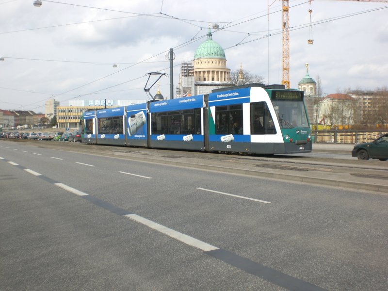 Potsdam: Straßenbahnlinie 96 nach Bornstedter Feld Viereckremise an der Haltestelle Lange Brücke.