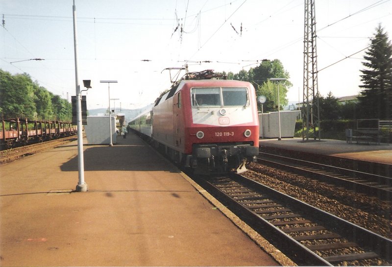 120 119-3 mit dem IC  Alpenland  im Bahnhof Eschwege West. Ziel des IC war Obersdorf. Sommer 1995. Foto-Scan.