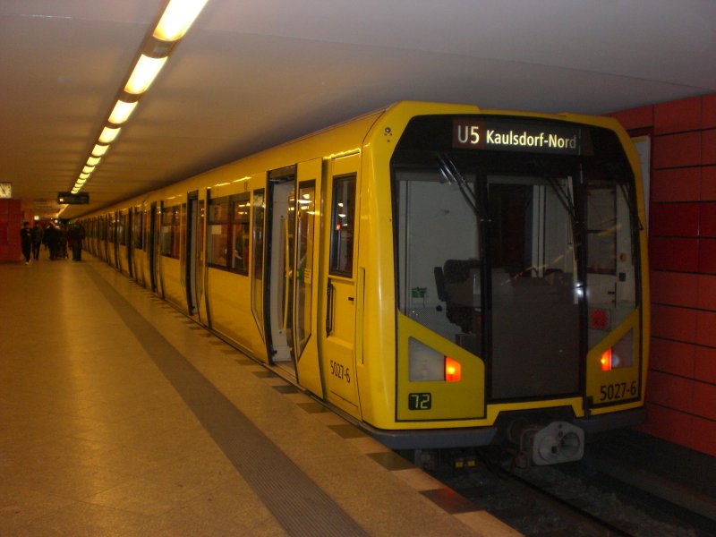 Berlin: Die U5 nach U-Bahnhof Kaulsdorf-Nord im S+U Bahnhof Frankfurter Allee.