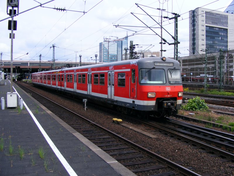 Ein Vollzug der S-Bahn-Baureihe 420 bei der Einfahrt in den Düsseldorfer Hbf als Linie S 7 nach Solingen-Ohligs am 20. Juni 2008.