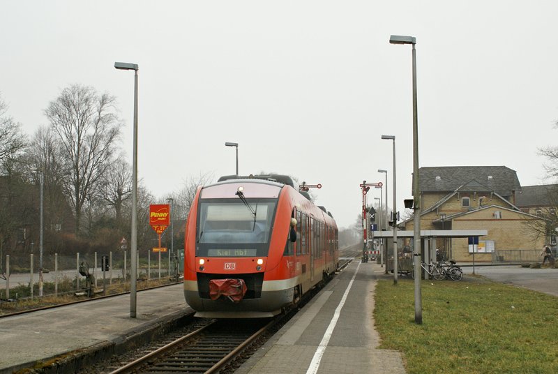 Ein LINT 41 passiert als RB nach Flensburg am 01.03.2009 den Bahnhof von Neuwittenbek.