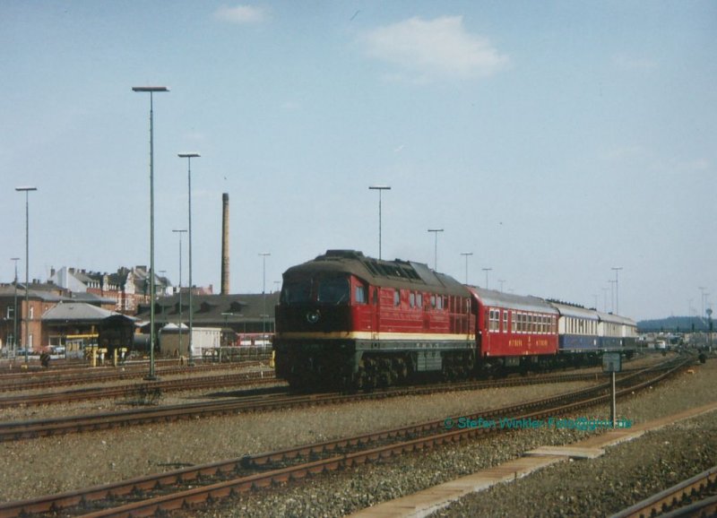 120 119-3 mit dem IC "Alpenland" im Bahnhof Eschwege West. Ziel des IC war Obersdorf. Sommer 1995. Foto-Scan.