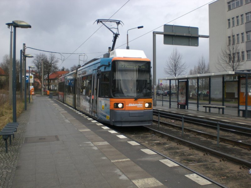 Ein DUEWAG-Stadtbahnwagen M6 der MVG in der Haltestelle Grenze Borbeck in Mülheim/Ruhr als Linie 104 vom Hauptfriedhof am 19. März 2009.