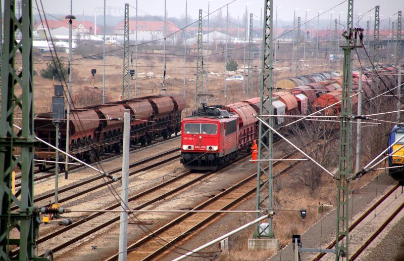 ...um sich an einen leeren Getreidezug zu setzen. 155 081 steht am 16.03.09 in Bitterfeld.