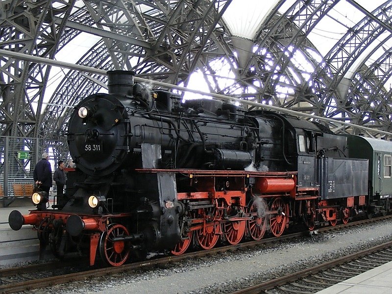 Detailaufnahme des Innentreibwerkes von 58 311 im Bahnhof Schlettau. Man beachte den Öltropfen. (14.03.09)