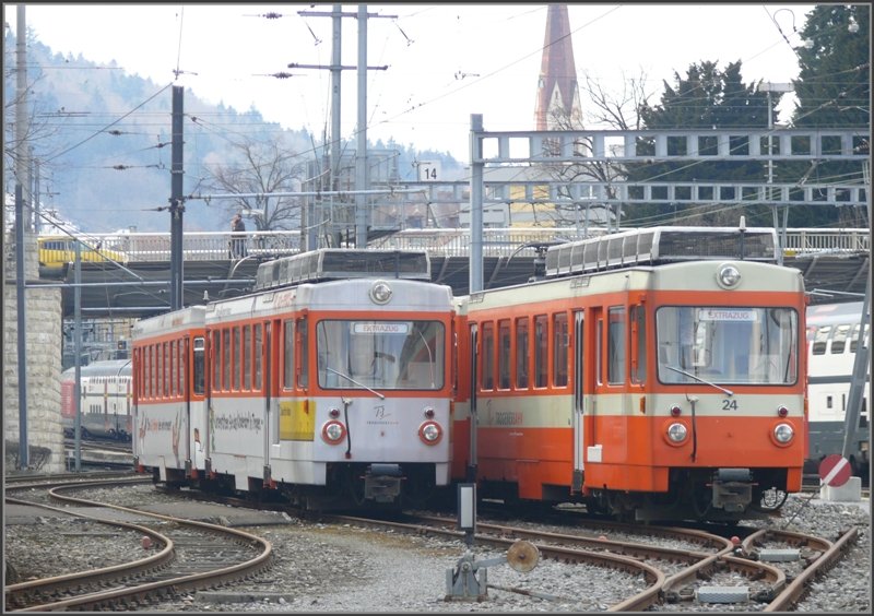 Stossverkehr und Ersatzfahrzeuge Be 4/4 der TB abgestellt im Nebenbahnhof St.Gallen. (20.03.2009)