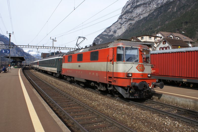 So kann IC-Verkehr aussehen, wenn der Bahn durch ICE-Ersatzverkehr die Loks und Wagen ausgehen: MRCEdispolok Taurus ES64 U2-014 alias 182 514-0 mit zwei IC-Wagen und 6 schon recht betagten Wagen von Bahn Touristik Express am 19.03.09